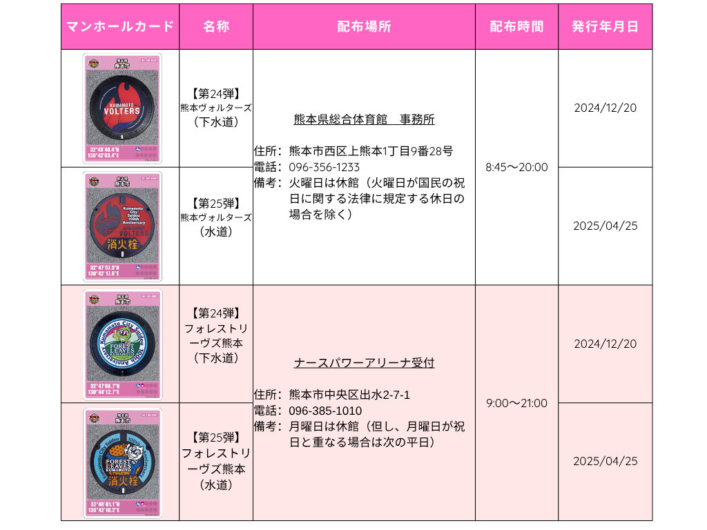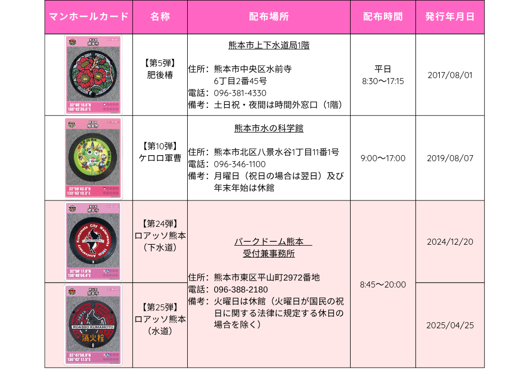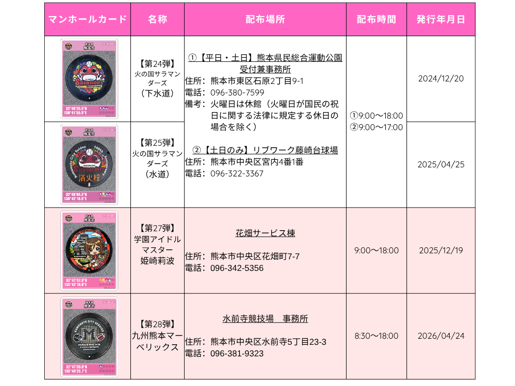 熊本市のマンホールカードの配布状況は以下のとおりです。