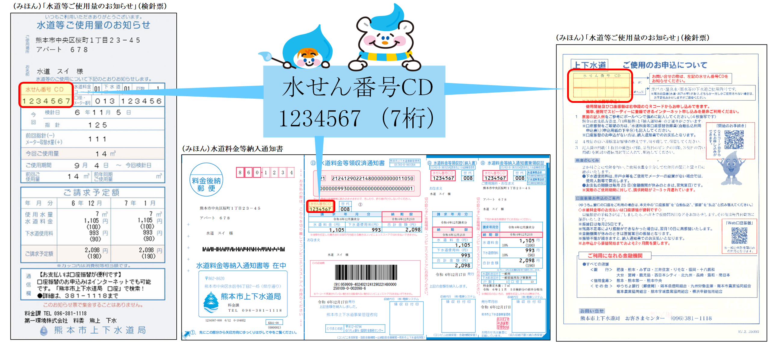 手続きの際は、水せん番号CDが必要となります。水せん番号CDは、「水道等ご使用量のお知らせ」(検針票)または「水道料金等納入通知書」などに記載されています。