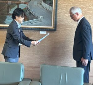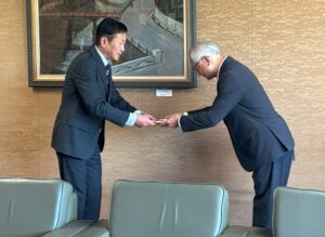 当日は、日之出水道機器株式会社 代表取締役社長兼COO 浅井 武様、九州支店 熊本営業所 所長 小久保 寛様にご来庁いただきました。
